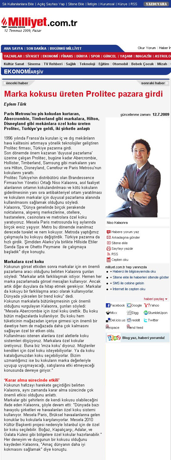 Paris Metrosu'nu pis kokudan kurtaran, Abercrombie, Timberland gibi markalara, Hilton, Disneyland gibi mekanlara özel koku üreten Prolitec, Türkiye'ye geldi.